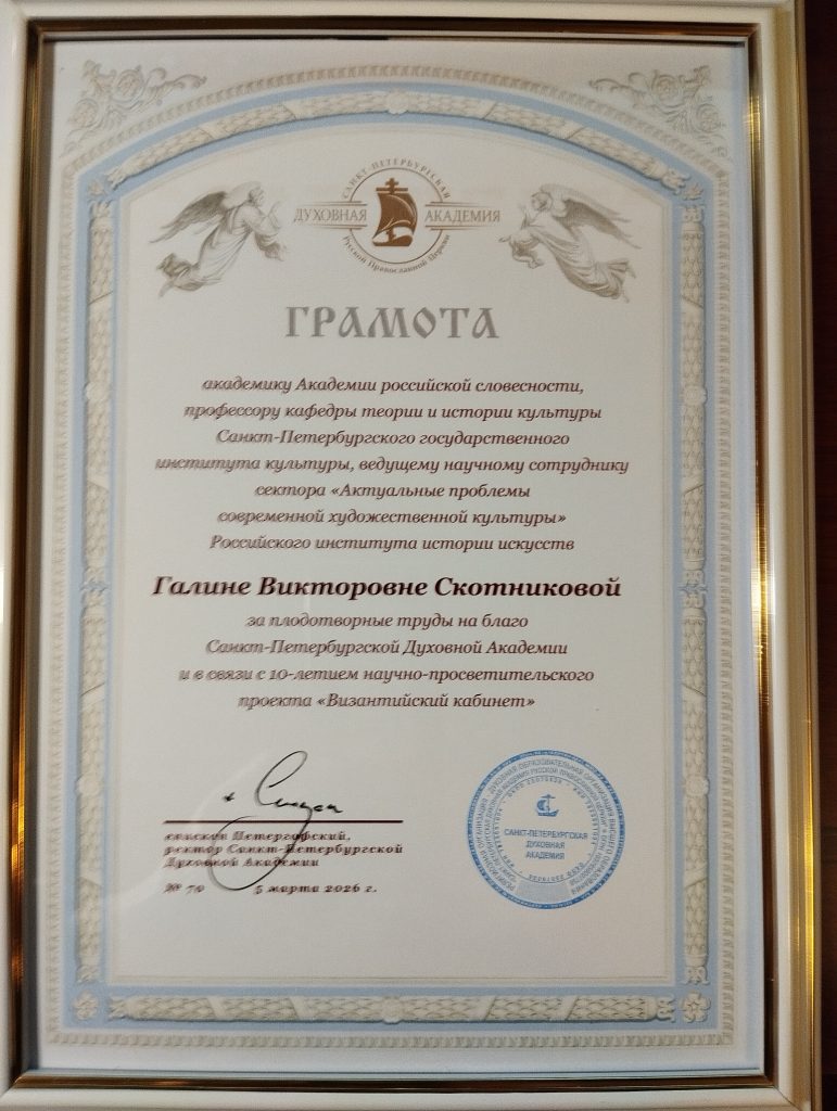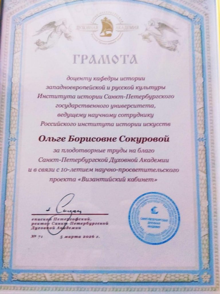 Главная > Новости > Г. В. Скотникова и О. Б. Сокурова награждены памятной грамотой в связи с 10-летием научно-просветительского проекта «Византийский кабинет»