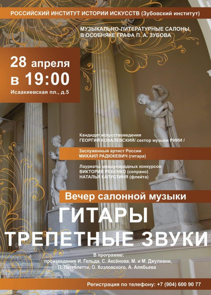 В слове «гитара» ряд исследователей резонно видят санскритский корень «гита», что в переводе на русский язык означает «песня». Обычно этот инструмент и представляют как сопровождающий пение или танец. На протяжении своей долгой истории гитара знала свои взлеты и падения, гитара звучала в царских хоромах и в утлых лачугах, в руках блестящих профессионалов и под робкими пальцами любителей. В XIX веке происходит формирование гитары современного типа, а количество написанной для нее музыки — огромно и включает в себя самые разные жанры и стили. На вечере в исполнении известного петербургского гитариста, заслуженного артиста России Михаила Радюкевича прозвучали как популярные и всеми любимые мелодии («Соловей» Алябьева), так и настоящие раритеты, произведения, ноты которых хранятся в рукописных архивах и особых собраниях. В программе приняли участие лауреаты международных конкурсов Виктория Ребенко (сопрано) и Наталья Капустина (флейта). Концерт сопровождался комментариями научного сотрудника РИИИ Георгия Ковалевского, который рассказал о судьбе этого инструмента в России, а также об исполнителях и композиторах, чьи имена вошли в золотой фонд гитарной музыки.