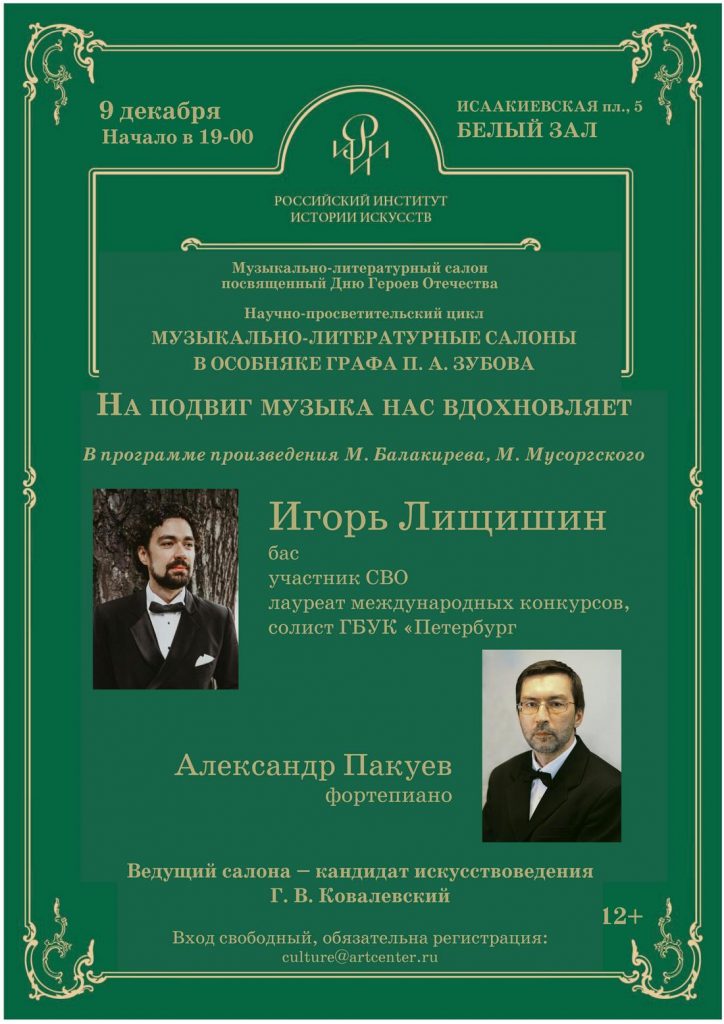 9 декабря 2025 года в Белом зале Российского института истории искусств состялся музыкально-литературный салон «На подвиг музыка нас вдохновляет», посвященный Дню Героев Отечества (научно-просветительский цикл «Музыкально-литературные салоны в особняке графа П. А. Зубова. Из собрания Кабинета рукописей РИИИ») в рамках проведения в Российской Федерации Года защитника Отечества. День Героев Отечества — это день памяти и гордости, день, когда мы вспоминаем тех, кто защищал и защищает нашу Родину, проявляя мужество, стойкость и героизм. Этот праздник, как никогда, важен сегодня.