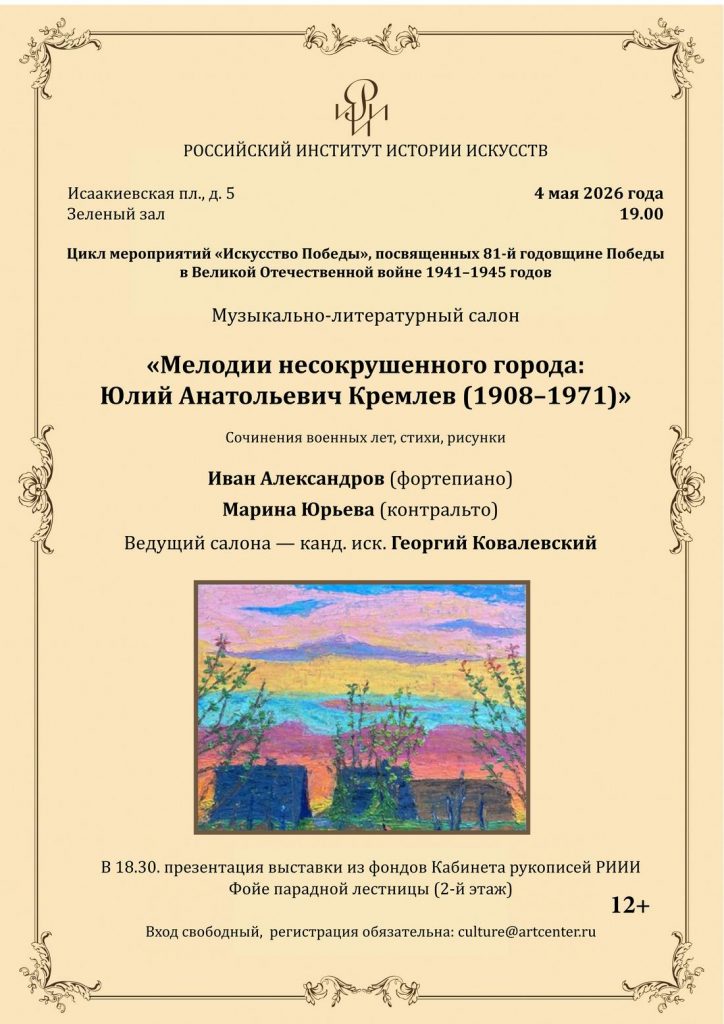 4 мая 2026 года в 19.00 в Зеленом зале Российского института истории искусств состоится музыкально-литературный салон «Мелодии несокрушенного города: Юлий Анатольевич Кремлев (1908–1971)» (цикл мероприятий, посвященных 81-й годовщине Победы в Великой Отечественной войне 1941–1945 годов).
