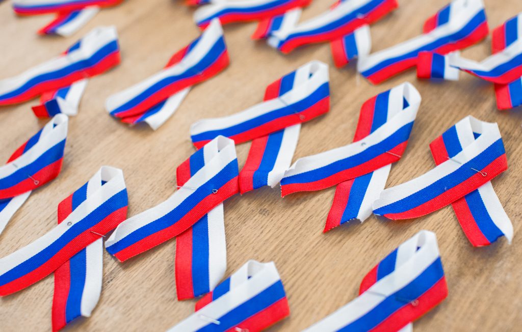 Перед концертом в рамках Всероссийской акции «Цвета Родины» члены Молодежного совета Российского института истории искусств вручали гостям ленточки в цветах флага Российской Федерации.