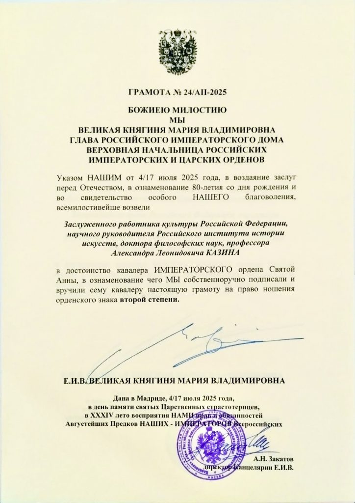 Главный научный сотрудник Российского института истории искусств, профессор, заслуженный работник культуры Российской Федерации Александр Леонидович Казин удостоен ряда престижных, высоких наград: