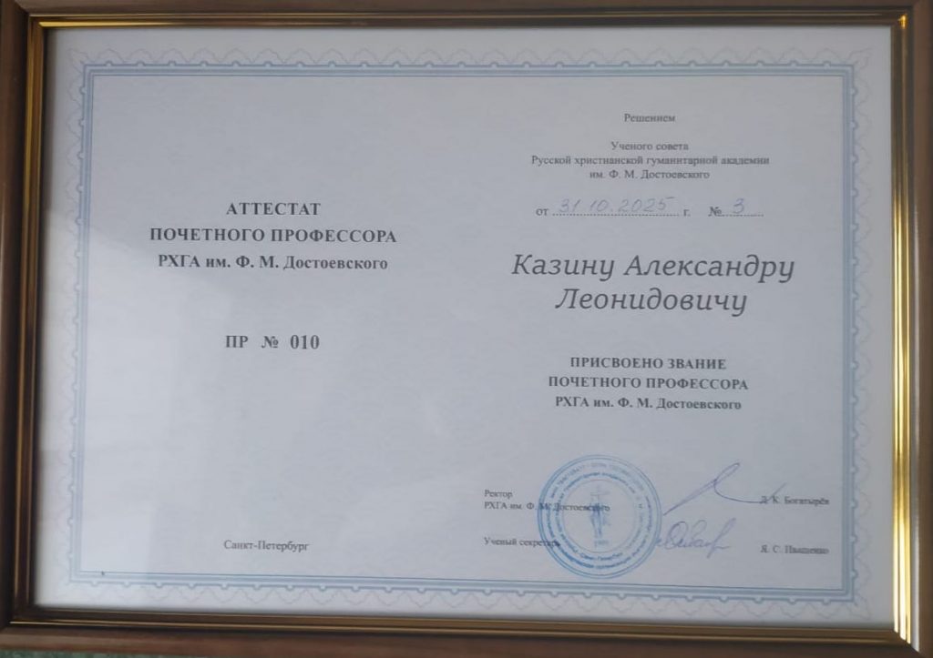 А. Л. Казин стал почетным профессором Русской христианской гуманитарной академии имени Ф. М. Достоевского.
